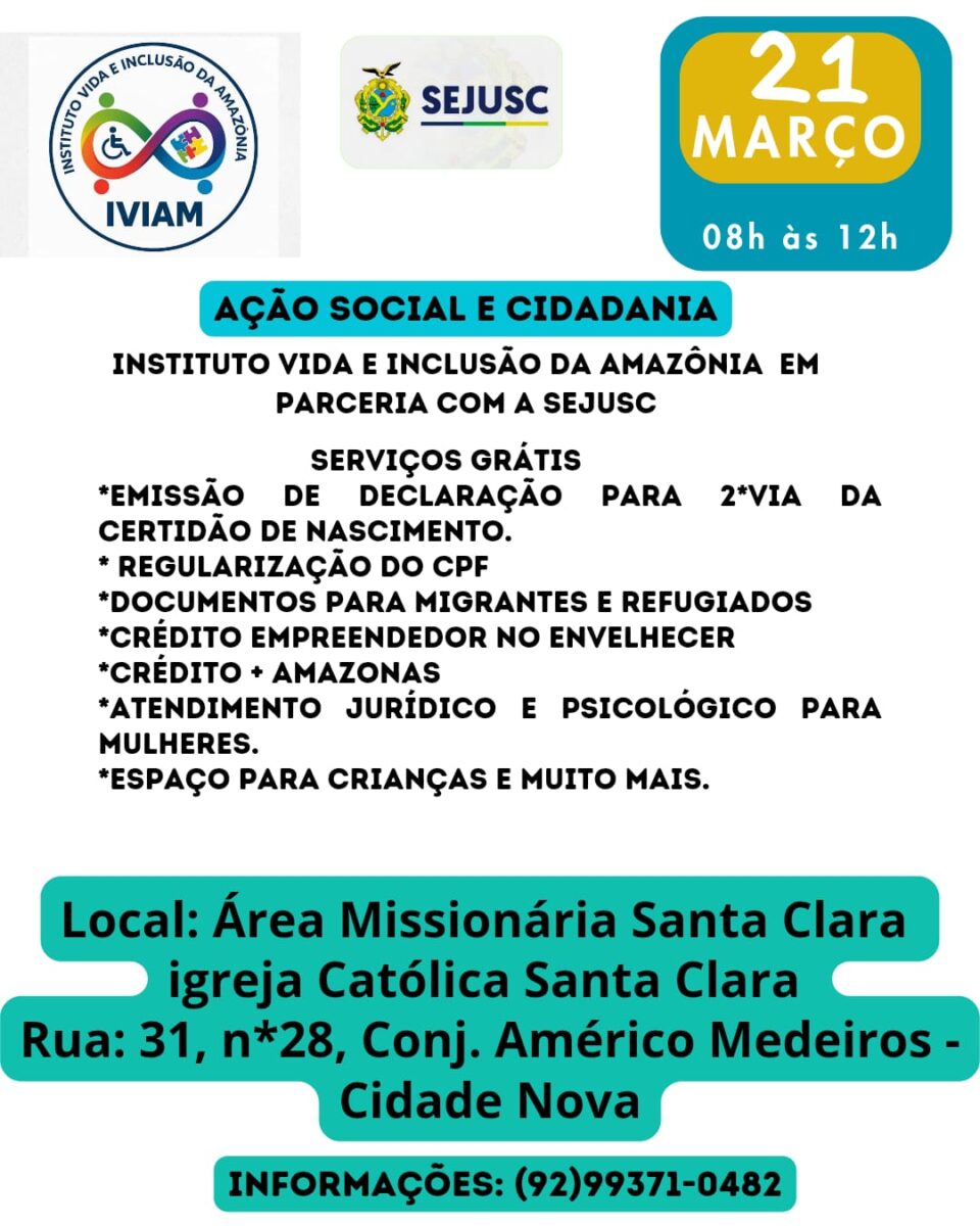 A iniciativa é promovida pelo Instituto Vida e Inclusão da Amazônia (IVIAM) em parceria com a SEJUSC (Secretaria de Justiça, Direitos Humanos e Cidadania), com o objetivo de facilitar o acesso da população a documentos, orientações e serviços essenciais.