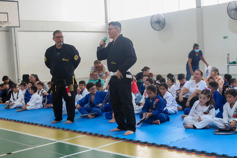 Aproximadamente 120 alunos da Educação Infantil e do 1º ao 5º ano do Ensino Fundamental, do Centro Integrado Municipal de Educação (Cime) Lucia Melo Ferreira Almeida, no bairro Novo Aleixo, zona Norte, da Prefeitura de Manaus, participaram, nesta sexta-feira, 12/12, da solenidade de troca de faixas do projeto “Aprender Lutando”. Idealizada pela Secretaria Municipal de Educação (Semed), a iniciativa promoveu a entrega das faixas cinza e branca de jiu-jítsu às crianças. O evento contou com a presença de professores, pedagogos, além dos pais e responsáveis.