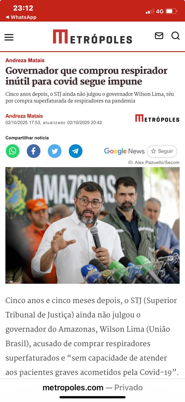 Segundo a reportagem, os equipamentos custaram mais de R$ 110 mil cada, enquanto o valor de mercado era próximo de R$ 17 mil, gerando um prejuízo superior a R$ 2 milhões aos cofres públicos. O processo, que tramita no Superior Tribunal de Justiça (STJ) desde 2021, tornou Wilson Lima réu, mas até hoje não foi julgado.