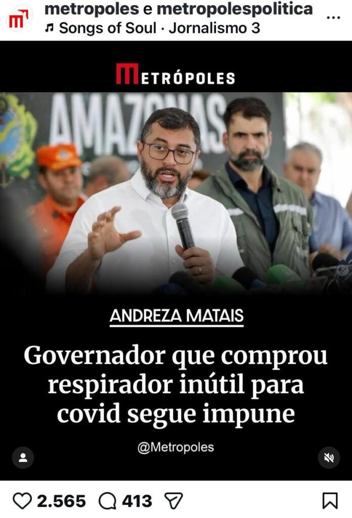A matéria do Metrópoles traz como tema: “Governador que comprou respirador inútil para Covid segue impune”, evidenciando uma série de erros incalculáveis que trouxeram à sociedade dor e a perda de milhares de vidas inocentes.