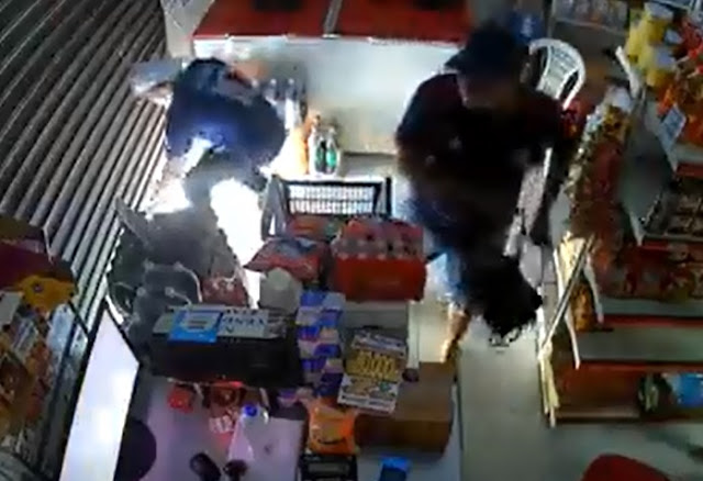 Câmeras de segurança flagraram o momento em que dois assaltantes invadiram um mercadinho e deixaram pessoas desesperadas, no conjunto Cidadão 12, no bairro Monte das Oliveiras, zona Norte de Manaus, durante a tarde dessa segunda-feira (27).