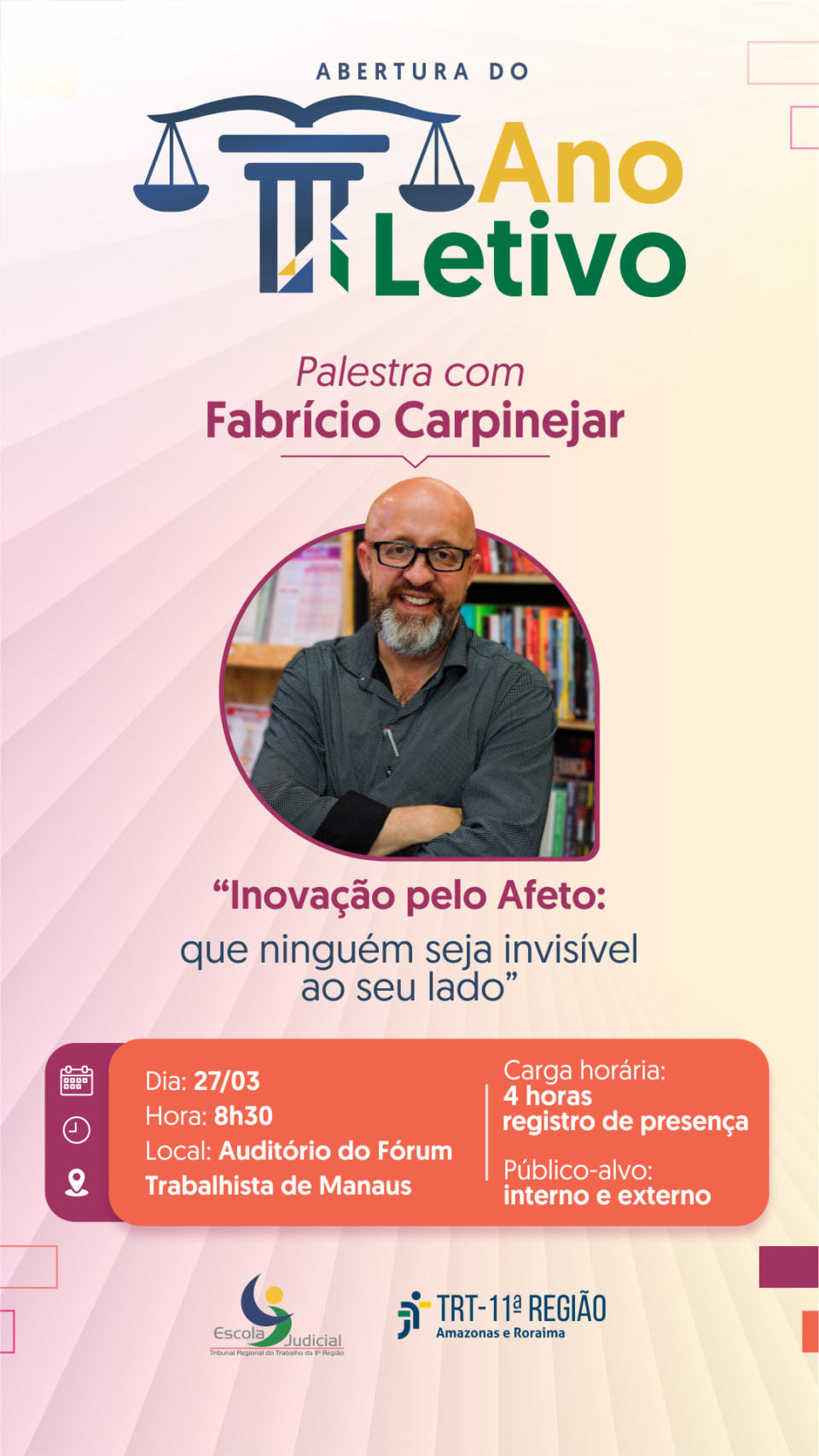 A Escola Judicial do Tribunal Regional do Trabalho da 11ª Região (Ejud11) realiza, no dia 27 de março, a abertura do Ano Letivo 2026 com a palestra “Inovação pelo Afeto: que ninguém seja invisível ao seu lado”, ministrada pelo escritor e palestrante Fabrício Carpinejar. O evento terá início às 8h30, no Auditório do Fórum Trabalhista de Manaus, com transmissão ao vivo pelo canal da Ejud11 no YouTube.