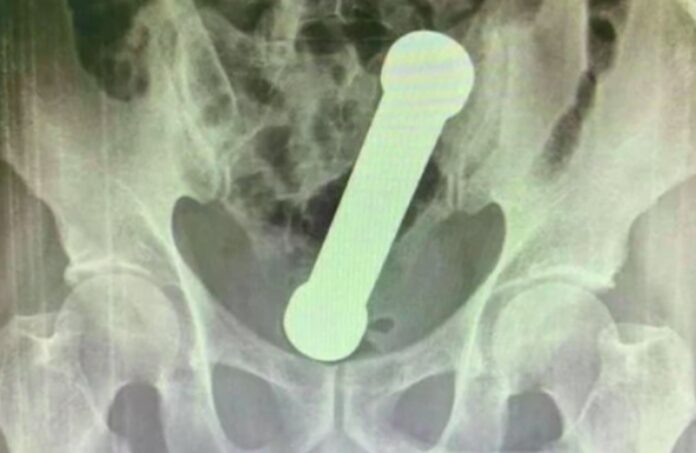 Ao realizarem um exame de raio-X, os médicos encontraram um peso de dois quilos, de cerca de 20 centímetros de comprimento, como os que são usados em academias de ginástica para exercícios de braço, dentro do homem.