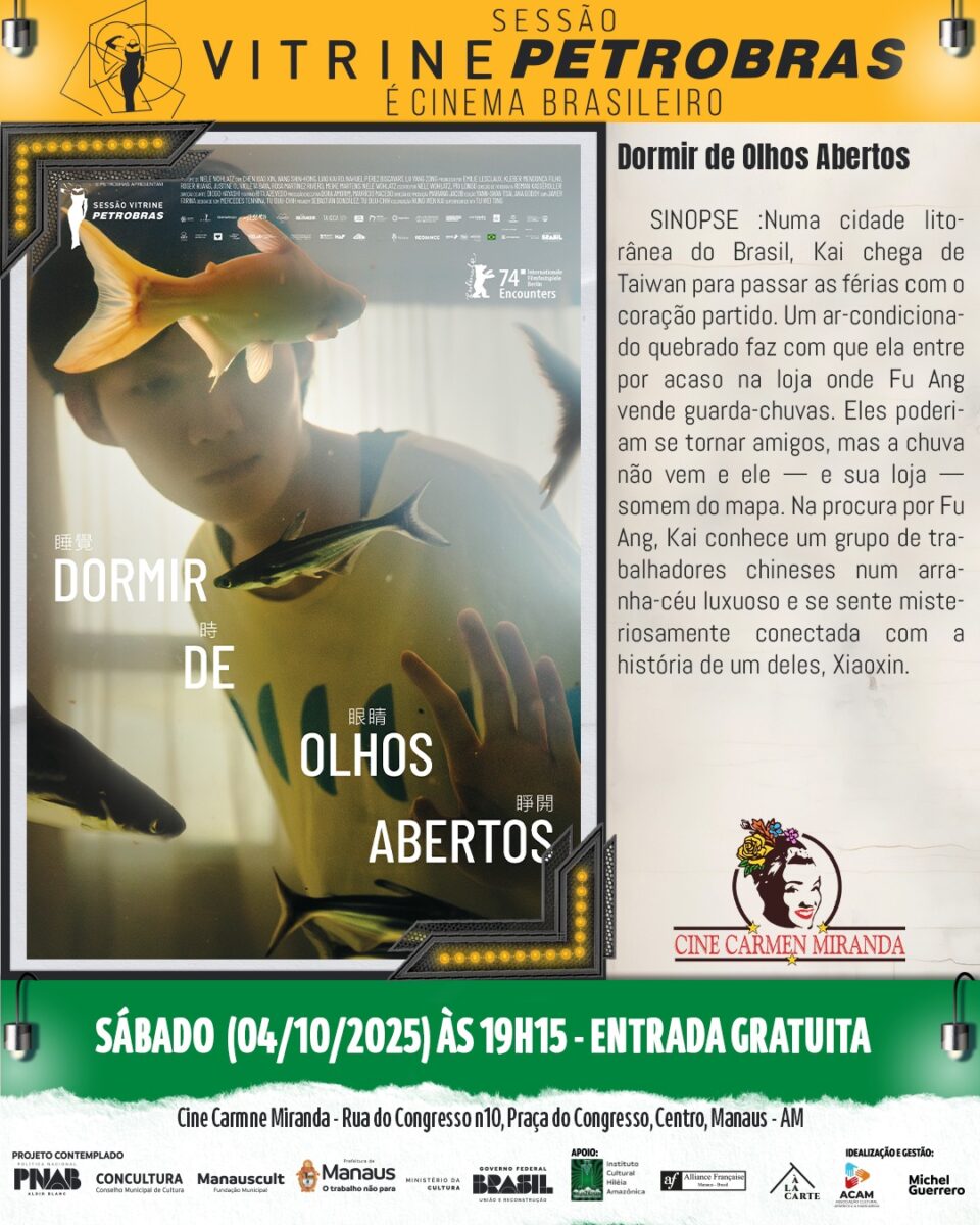 Em parceria com a Vitrine Filmes, o Cine Carmen Miranda exibe de 2 a 4 de outubro o ciclo ‘Sessão Vitrine Petrobrás – É cinema brasileiro’ com os filmes ‘Kasabranca’ (02/10, às 18h), ‘Um lobo entre os cisnes’ (03/10, às 18h), ‘O melhor amigo’ (03/10, às 19h40), ‘Saneamento básico – O filme’ e ‘Ilha das flores’ (04/10, às 17h) e ‘Dormir de olhos abertos’ (04/10, às 19h15). A maratona de filmes nacionais é gratuita.