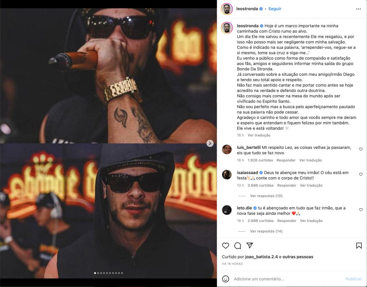 Por fim, o músico agradeceu o suporte recebido pelos fãs. “Agradeço o carinho e todo amor que vocês sempre me deram e espero que entendam e fiquem felizes por mim também. Ele vive e está voltando”, encerrou. Em um vídeo do YouTube, Leo ainda explicou o futuro do Bonde da Stronda.