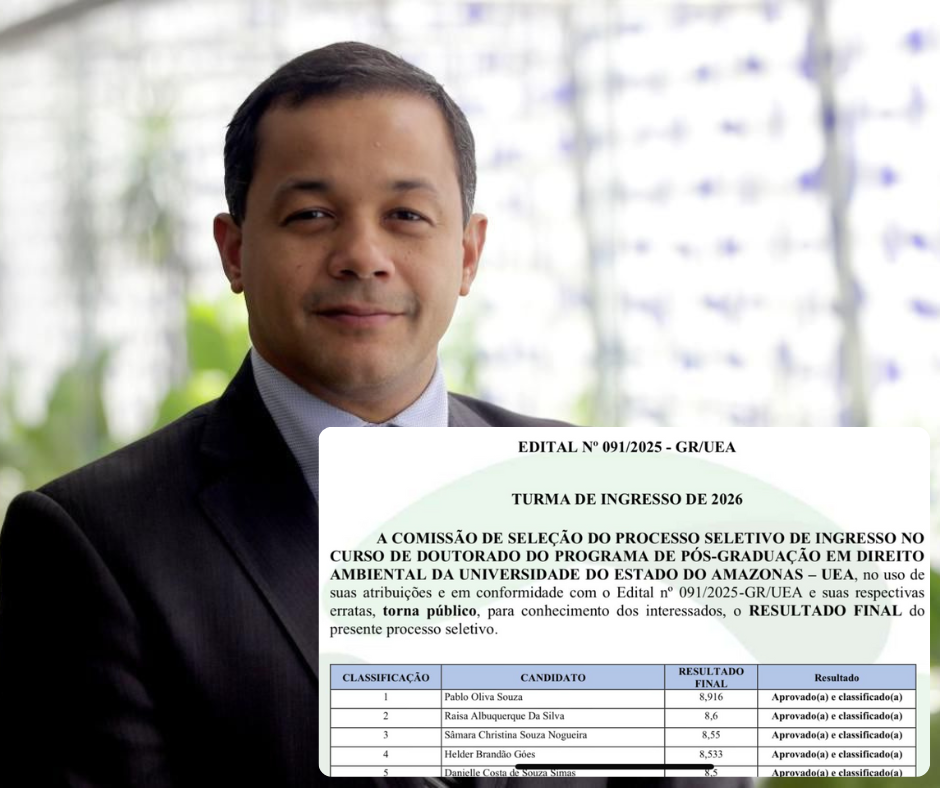 O delegado da Polícia Federal Pablo Oliva acaba de alcançar um feito marcante no cenário acadêmico amazonense. Ele foi aprovado em primeiro lugar no processo seletivo do Doutorado em Direito Ambiental da Universidade do Estado do Amazonas (UEA), obtendo a maior nota já registrada na avaliação.