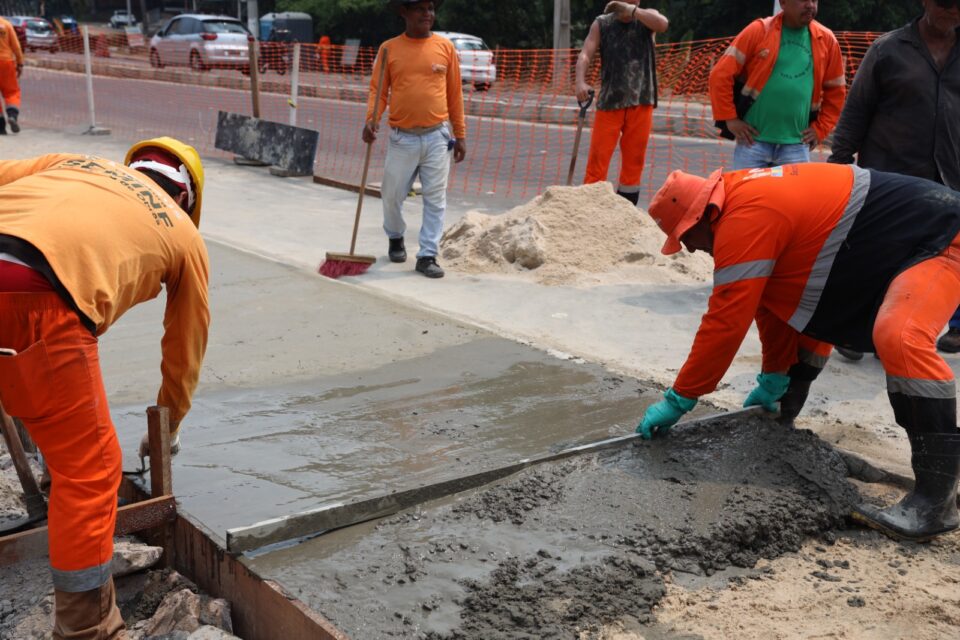 Prefeitura de Manaus, por meio da Secretaria Municipal de Infraestrutura (Seminf), realiza, nesta quarta-feira, 20/11, a reconstrução de 200 metros do passeio público na avenida Mário Ypiranga Monteiro, após a grande intervenção em tempo recorde da substituição da nova tecnologia da drenagem profunda por aduelas de concreto armado.
